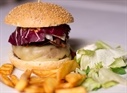 Carne di scottona 100%, per un originale hamburger a Milano, con pomodoro, icerberg, peperoni, cetriolini,zucchine, melanzane,maionese Con contorno di patatine e insalata.